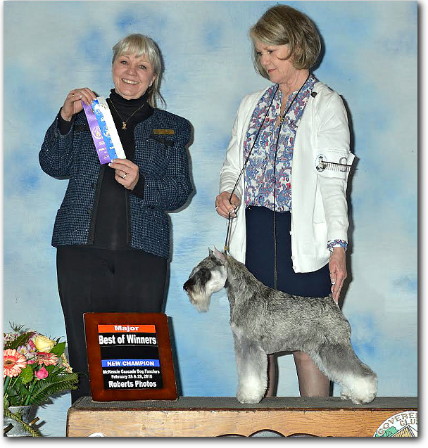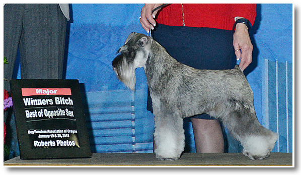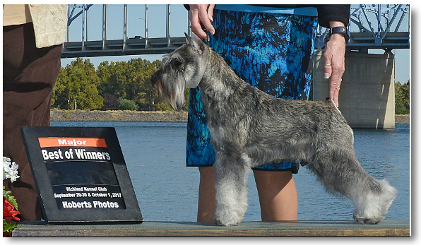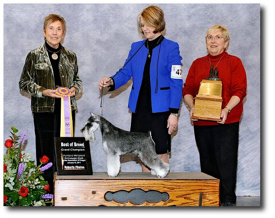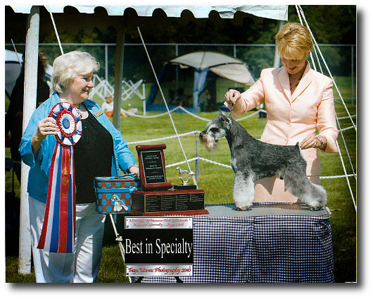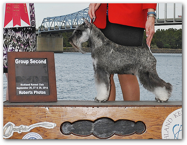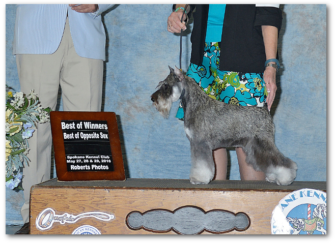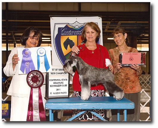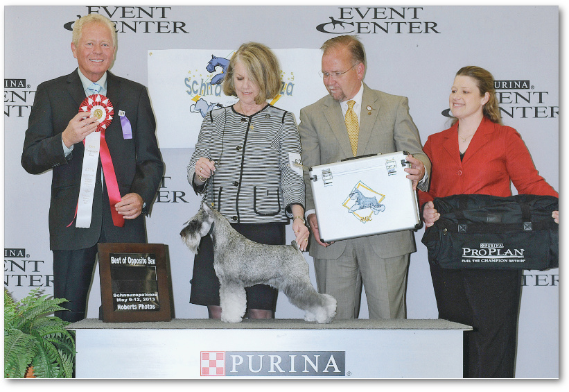 Lola is shown winning Best Of Opposite Sex at probably the largest Miniature Schnauzer show ever in the US, with some 160 Miniature Schnauzer showdogs entered, at the Purina Farms Event Center outside St. Louis, MO, May 9-12, 2013.   This was the American Miniature Schnauzer Club's (AMSC) 2013 "Schnauzapalooza" event for its National Specialty show.  From left to right are Judge Clay Coady, Patty, AMSC President John Constantine and a Purina Farms representative.