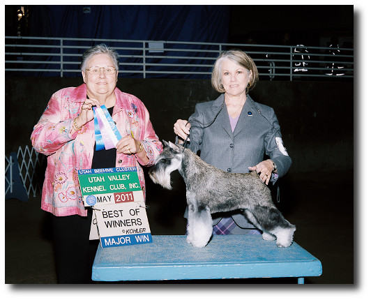 Ten month old puppy "Louie" is shown at left winning Best of Winners for a 5-point major at the Centennial State Miniature Schnauzer Specialty show in Denver, June 3, 2011, to finish his AKC championship in only one month, entered in five shows (all major shows), winning four of them.  The four wins were three 4-point and one 5-point majors.  Louie is shown at right winning one of the three 4-point major wins at the Beehive Cluster in Salt Lake City.  It was Louie's first competitive event and he was Best of Winners in three of the four shows while proving he's a natural in the ring.  He finished his Grand Champion title in February, 2012.  Louie was sired by CH Tomar's The Fix Is In ("Bookie") and his dam is Legacy's Charisma ("Chrissy").  He is a wonderful dog around the house and just wants to play all the time.  See Pedigree (PDF).