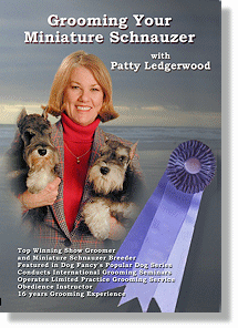 A grooming DVD for your Miniature Schnauzer pet!  75 minutes of grooming instruction presented by top-winning show groomer and Miniature Schnauzer breeder Patty Ledgerwood.  Professional videography by LightCurve, LLC features beautiful close-up shots and a menu-driven DVD format.  Grooming instruction is presented according to the standard defined by the American Kennel Club's national breed club, the American Miniature Schnauzer Club.  Click link below for more information and ordering, and see customer comments.